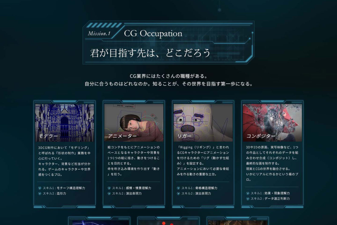 デジタルハリウッド専門スクールで、CG業界を目指す方々へ向けたLP制作のキービジュアルとサイトデザインを担当しました。
