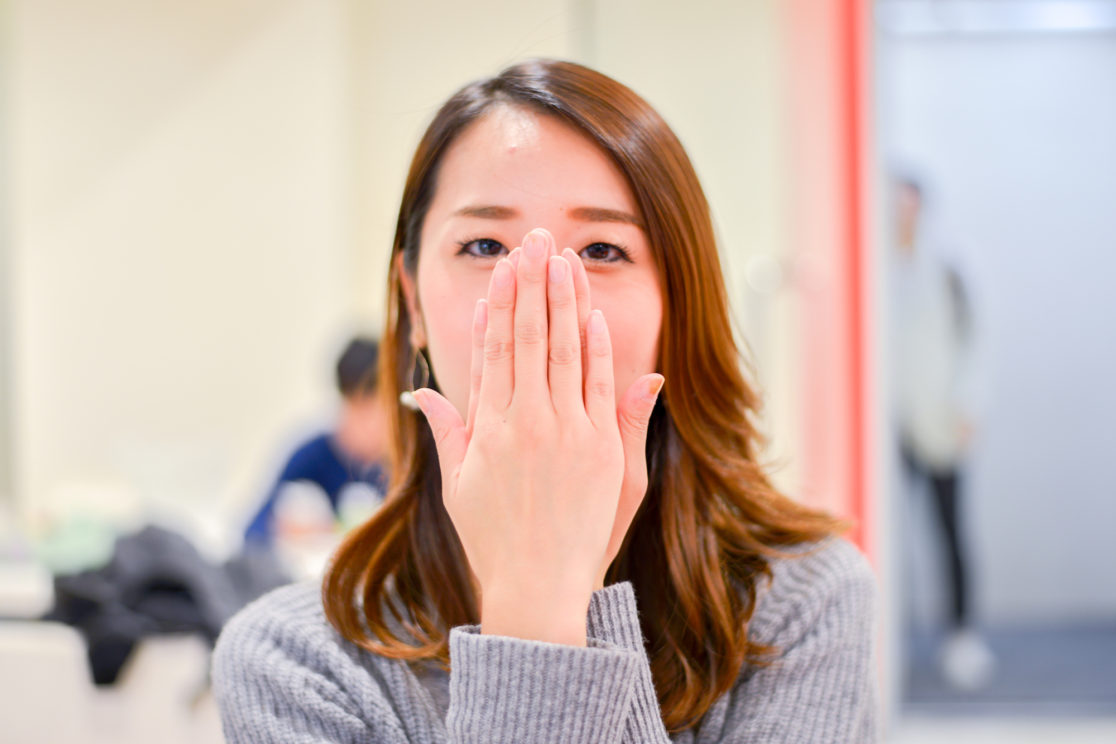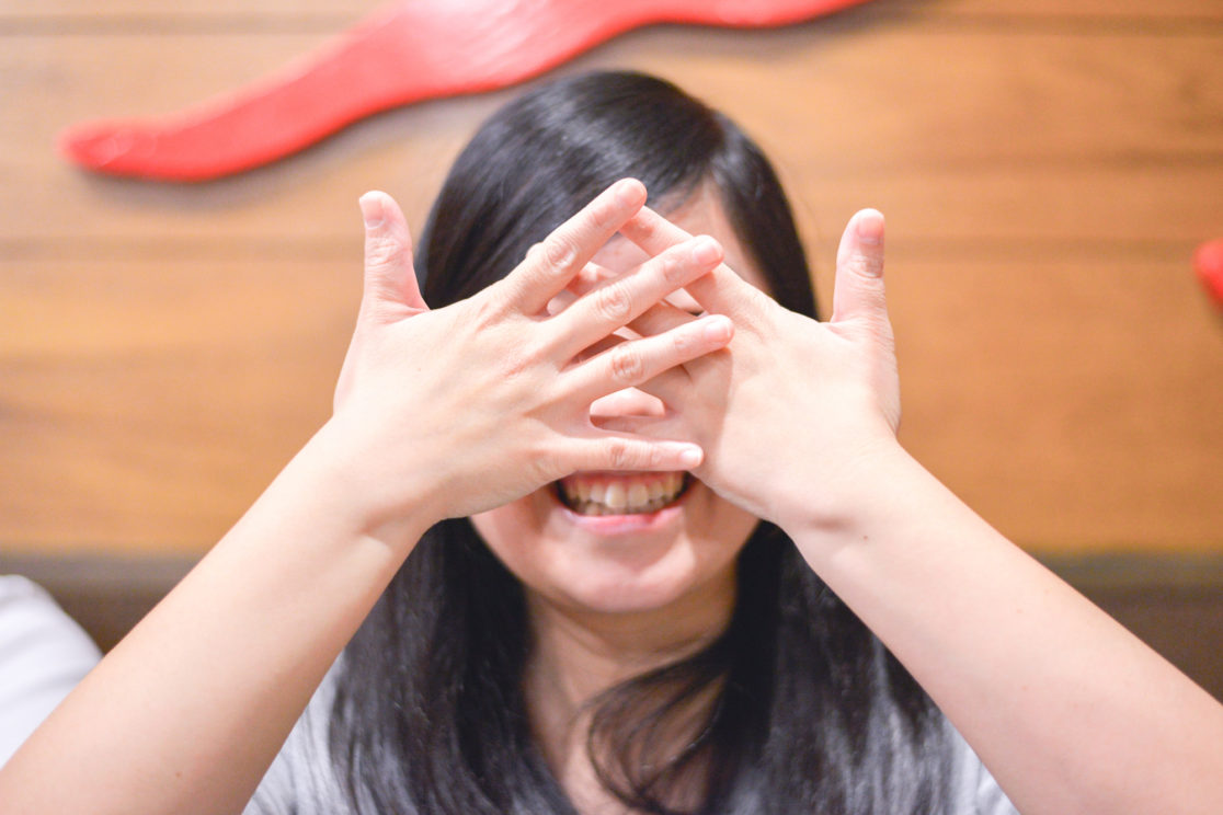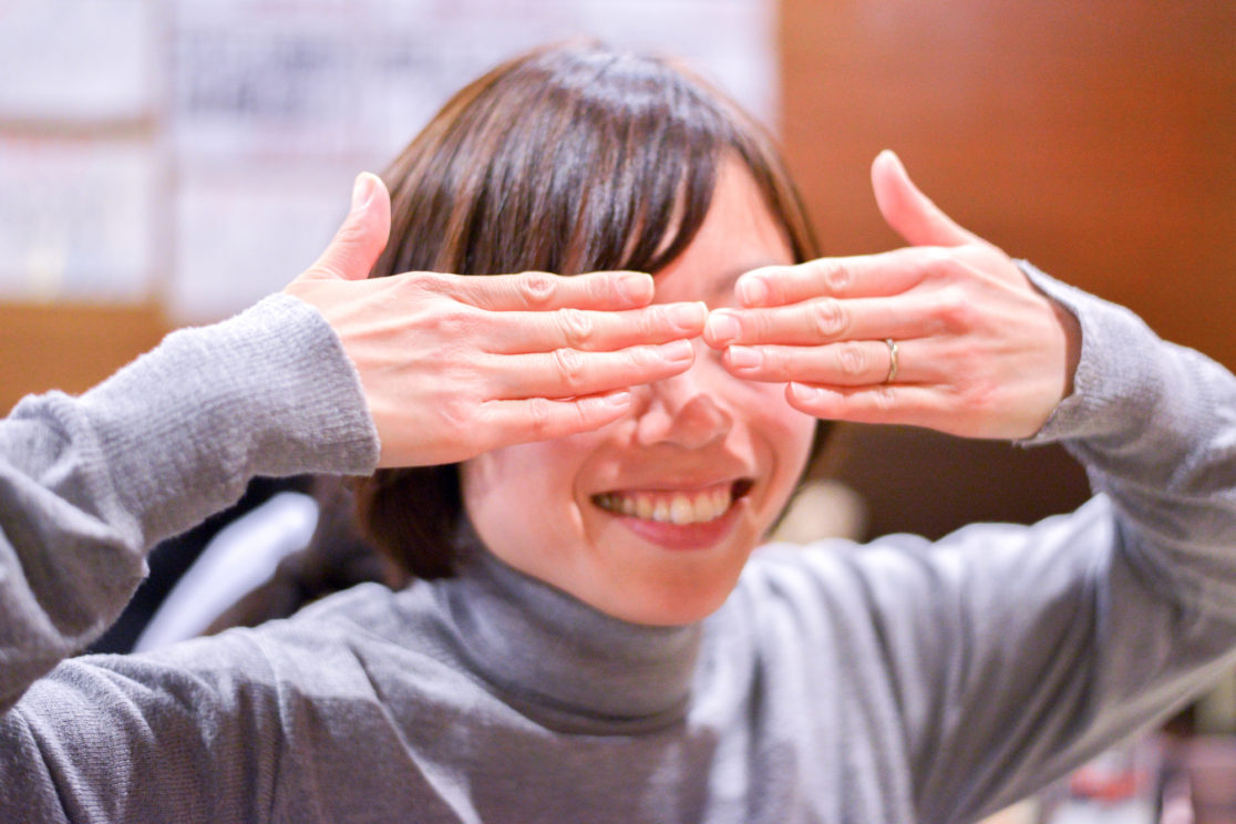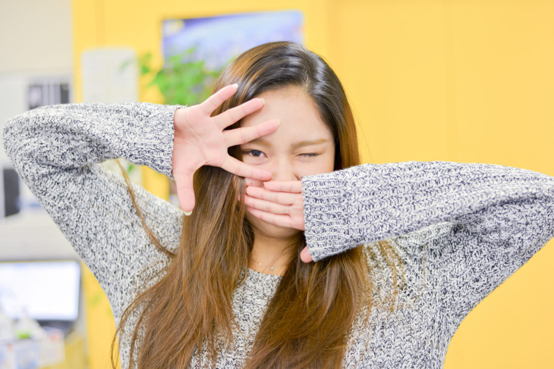 「両手が顔の前にあるポーズをとって」