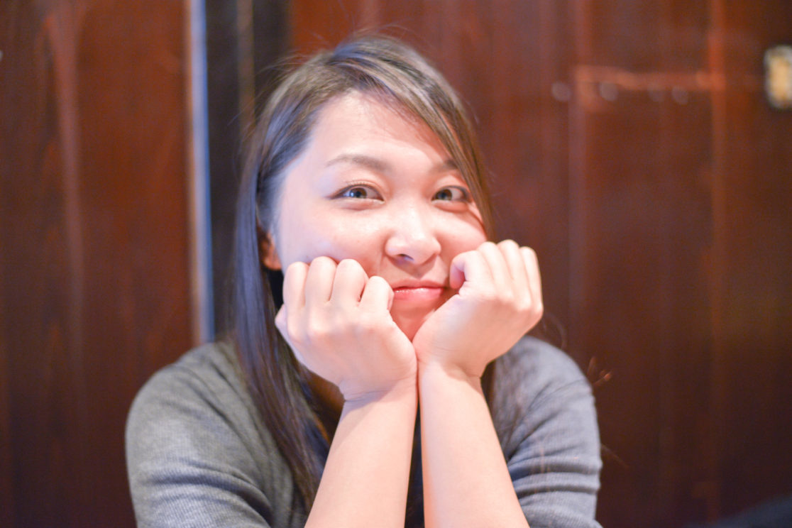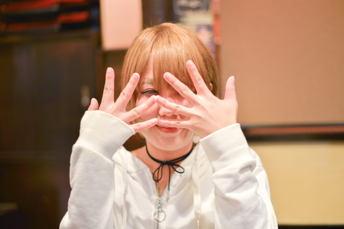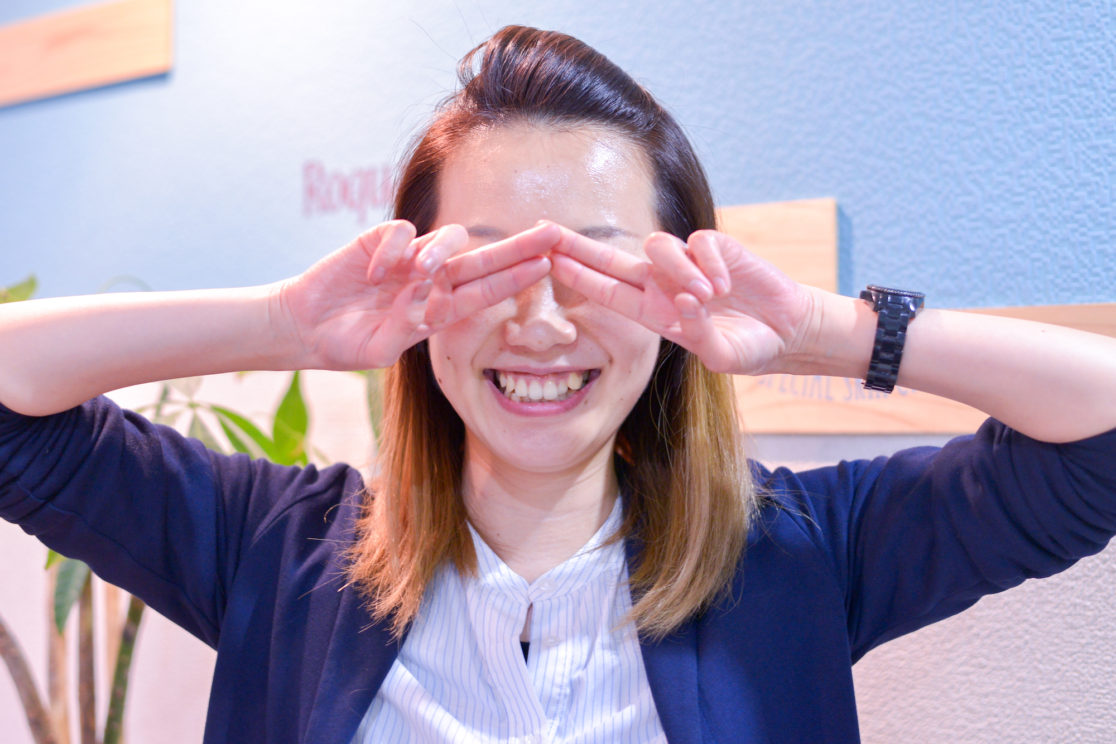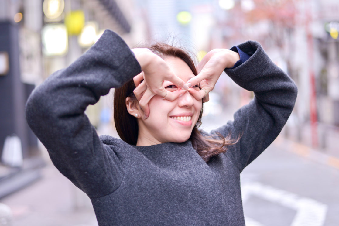 「両手が顔の前にあるポーズをとって」
